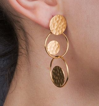 Chapados en Oro 18k. Su diseño en cascada aporta movimiento y luz al rostro, convirtiéndose en el accesorio ideal para elevar cualquier estilismo. La pieza presenta una estructura de tres niveles. Comienza con un disco superior de textura martillada que se ajusta al lóbulo. A continuación, dos aros entrelazados de acabado liso enmarcan discos interiores que replican el efecto rugoso y brillante. Este contraste de texturas (liso vs. martillado) maximiza el brillo del oro con cada movimiento. Chapado en Oro 18k La verdadera diferencia de esta joya reside en su acabado. No es un simple baño de color; es un chapado en oro de 18k.