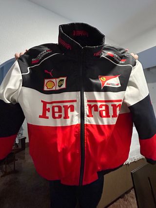 Chaqueta de estilo automovilístico con diseño llamativo. - Diseño con paneles en blanco, negro y rojo. - Bordados de SCUDERIA FERRARI y logos. - Cierre de cremallera frontal.