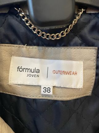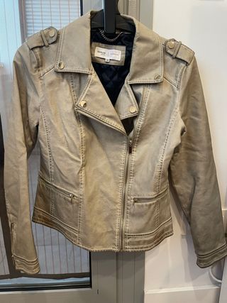 Chaqueta estilo motero con un diseño moderno y detalles cuidados. Es de la marca formula joven. Talla 38 y se encuentra nueva sin estrenar. El color es como champan - Cierre de cremallera asimétrica. - Bolsillos frontales con cremallera. - Solapas de muesca. - Puños con cremallera.