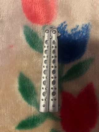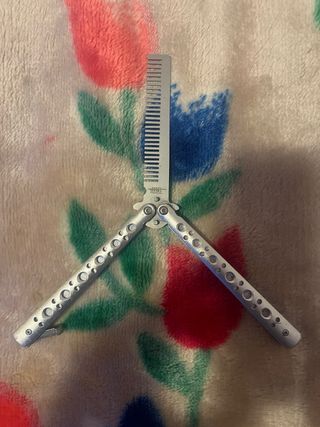 Peine tipo mariposa con un diseño calado. - Mango con múltiples orificios esteticos. - Mecanismo de apertura y cierre con seguro. -Hecho en toledo con acero inoxidable -Marca JKR