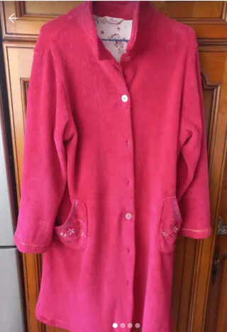 Bata de tacto suave para mujer. - Cierre de botones. - Bolsillos delanteros con bordado. - Cuello redondo.