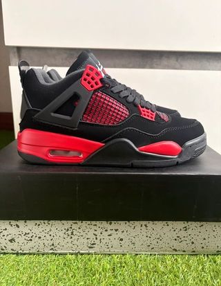 📦 No entrega presencial, solo envío InPost. ⚡️ Envío en 1 día hábil. 👟 Nuevo y original, con caja. 💰 Negociable, no rebajas excesivas. Zapatillas Jordan 4 con un diseño llamativo en negro y rojo. - Parte superior de ante negro. - Detalles en malla roja. - Suela de goma negra.