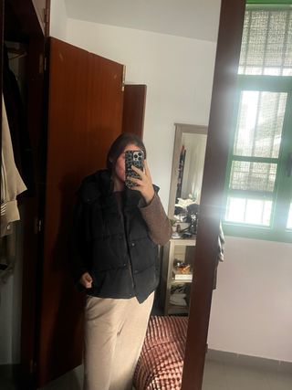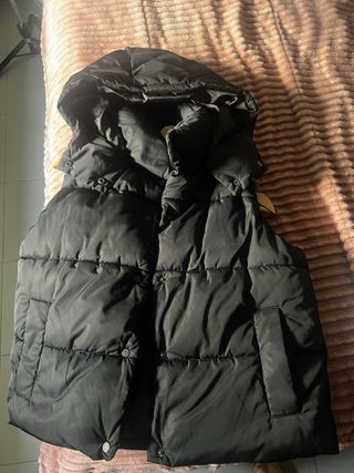 Chaquetón sin mangas en color negro. Se encuentra en buen estado. IMPORTANTE ES UNA TALLA XS PERO SIRVE PARA TALLA S - Diseño acolchado. - Cierre de botones. - Con capucha.