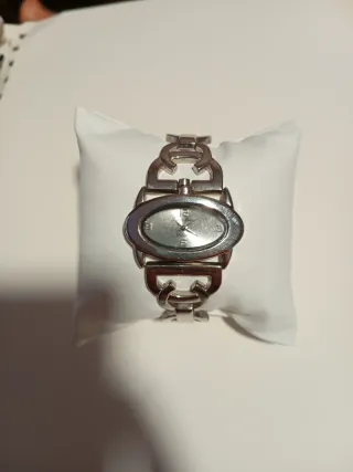 Elegante reloj de pulsera con un diseño sofisticado. - Esfera ovalada. - Brazalete metálico con eslabones. - Acabado plateado.