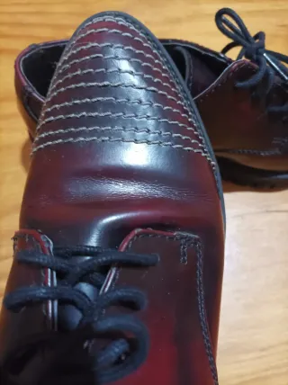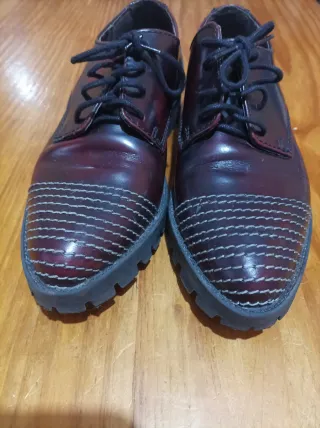 Zapatos estilo Oxford para mujer. - Granates. - Tres veces puestos. - Diseño de cordones. - Puntera con costuras decorativas.