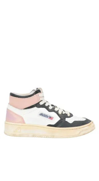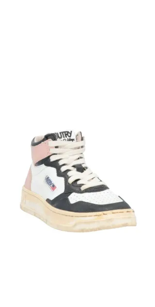 Zapatillas altas de la marca Autry en talla 37. Combinan paneles en blanco, negro y detalles en rosa pálido. - Diseño de caña alta. - Cierre con cordones. - Logo de la marca en el lateral.