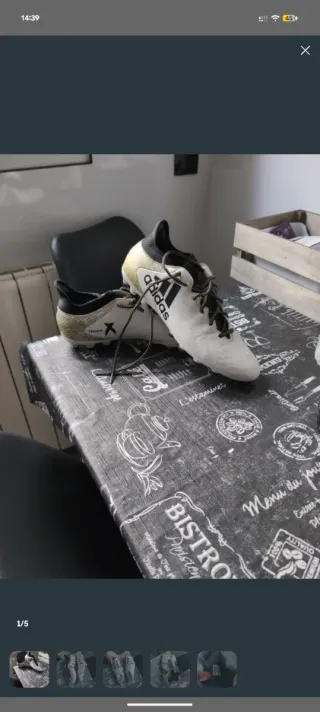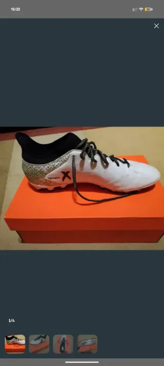 Descripción Botas de futbol Adidas X 16.3 con sujección techfit (agarre de calcetin en el tobillo). Taco redondo para superficies de cesped artificial. Talla 46 2/3 (US 12). Tejido sintetico, imitación cuero. Blanca, dorada y negra, como en la foto. Casi nuevas, apenas tiene dos usos En internet se venden ahora mismo por unos 40-50 €.