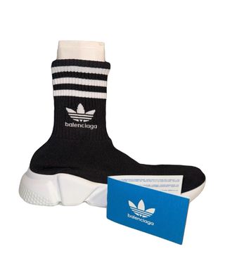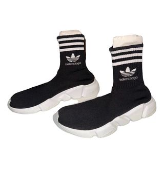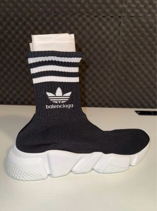 Zapatillas deportivas Balenciaga x Adidas Speed LT. - Diseño tipo calcetín. - Suela blanca gruesa. - Detalle de rayas en el cuello. - Logo de Adidas y Balenciaga.