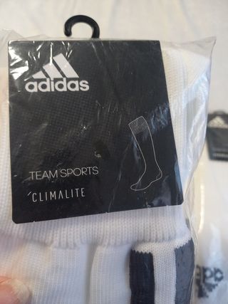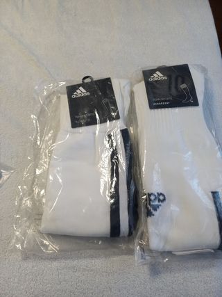 Vendo dos pares de calcetines de fútbol Adidas. Son de color blanco y de caña alta. - Tecnología ClimaLite para mantener los pies secos. - Ideales para entrenar o jugar partidos. - Están nuevos, sin usar.