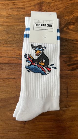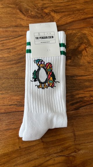 Calcetines deportivos blancos con diseño de pingüino levantando pesas. Tienen dos rayas negras en la parte superior. Elige la talla que quieras, tengo todas las tallas. Nuevos sin estrenar, con la etiqueta. - Marca: THE PENGUIN CREW - Tallas: 35-39 / 40-44 - Color: Blanco y negro