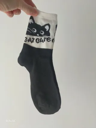 * No Correos * Fotos son descripción * Casa con gatos y libre de humo 📽 📦 Hago vídeo durante el empaquetado * No quedo en persona Calcetines para mujer o adolescente. Blanco y negro. "Cute". Gato negro. Clip rojo. Pie 35-38. Medidas referencia en las fotos. Son finos. 🧼 Llevan un clip (*) para que no se pierdan y se queden solitos cuando van a la lavadora o al cajón de los calcetines. 💪 (*) El clip es muy fuerte, así que hay que abrirlo con cuidado. Sin marca. ******** Calcetines con un divertido diseño de gatitos y el texto Cat Cute. - Diseño de gatitos en blanco y negro. - Detalle de un pequeño botón rojo en cada calcetín.