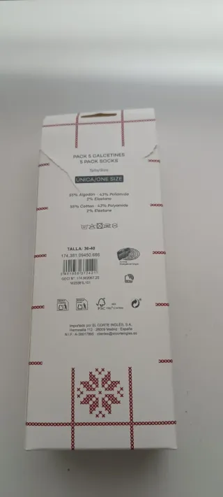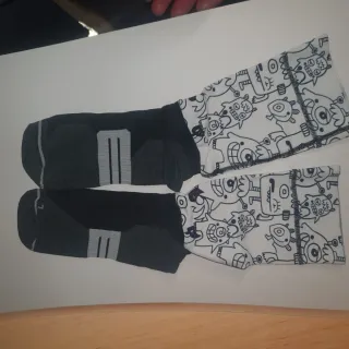 Dos pares de calcetines, unos blancos y otros negros. Con ojitos, y manos que se enganchan magnéticamente. La talla ponía que era de la 35 a la 40.