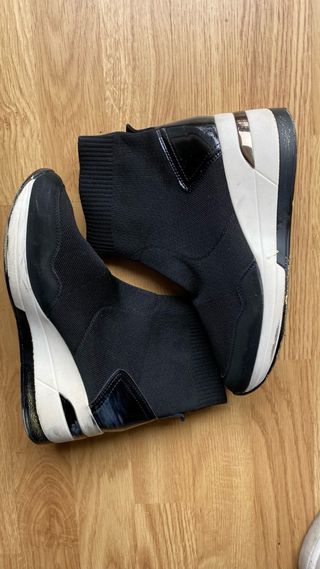 Botas tipo calcetín de color negro. Son cómodas y versátiles. Ideales para aquellas personas con piernas anchas puesto que se ajusta perfectamente. Es una talla 42 pero da talla hasta la 43. Se han utilizado en 2 ocasiones únicamente. Precio algo negociable - Diseño de caña alta. - Suela gruesa y resistente.