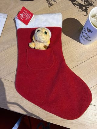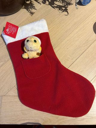 Calcetín navideño de felpa con un adorable peluche de Russ asomándose. Perfecto para rellenar de sorpresas. - Diseño de Papá Noel. - Peluche de personaje. - Material suave al tacto.