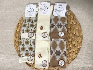 Lote de tres pares de calcetines de la marca POCHOL. - Diseño blanco con detalles de colores en la parte superior. - Uno de los pares es de color blanco roto con un distintivo circular que indica 100% Algodón. - Los otros dos pares tienen un borde de color (menta y melocotón) con un patrón de rombos en tonos pastel.