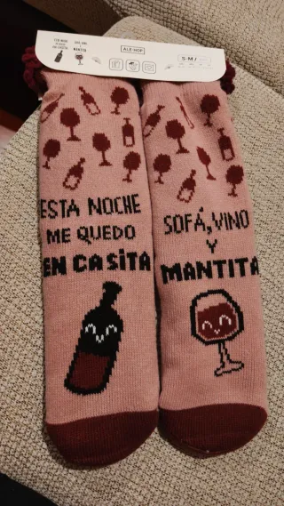 Calcetines gruesos con un divertido diseño de Esta noche me quedo en casita y Sofá, vino y mantita. Perfectos para estar cómodo en casa. - Diseño con botellas y copas de vino. - Puño de canalé con detalle. - Talla S-M.