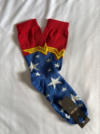 Calcetines con diseño inspirado en Wonder Woman. - Parte superior roja. - Diseño de estrellas blancas sobre fondo azul. - Detalle de la icónica W amarilla ¡Descuento por la compra de varios pares!