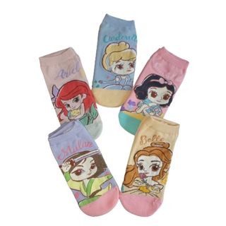 Conjunto de cinco pares de calcetines tobilleros con diseños de princesas Disney. - Diseño de Mulán - Diseño de Ariel - Diseño de Cenicienta - Diseño de Blancanieves - Diseño de Bella
