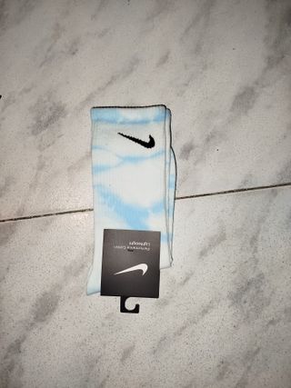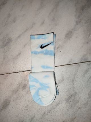 Par de calcetines Nike con un diseño tie-dye en tonos azules y blancos. Son cómodos y versátiles. - Diseño tie-dye único. - Logo de Nike visible.