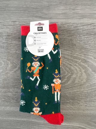 Calcetines con un divertido estampado navideño de cascanueces y copos de nieve. El diseño combina el color verde oscuro con detalles en rojo, naranja y azul. - Diseño de cascanueces y motivos invernales. - Talla: 39-42. - Puño y talón en color rojo.