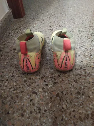 Botas de fútbol para niños o niñas. - Color amarillo y detalles en rosa. - Diseño tipo calcetín para un ajuste cómodo. - Marca Nike ( KM )