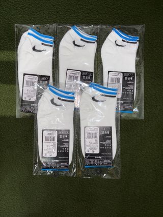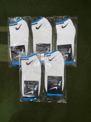 Pack de cinco pares de calcetines tobilleros de la marca Nike. Son cómodos y transpirables. - Diseño deportivo. - Banda elástica en el tobillo. - Logo de Nike visible.