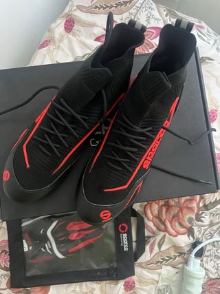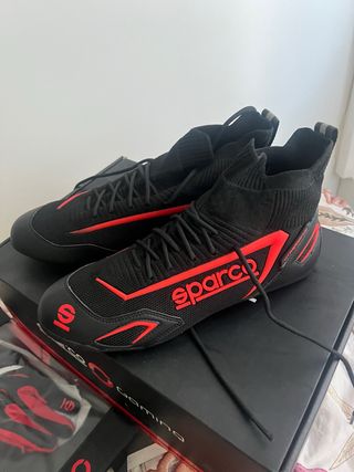 Botas Sparco de alta gama, perfectas para un look deportivo. - Diseño moderno en negro con detalles en rojo. - Cierre con cordones. - Caña alta tipo calcetín para un ajuste cómodo. - Usadas solo en simulador indoor.