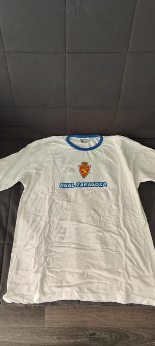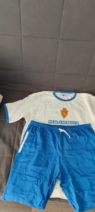 Pijama del Real Zaragoza con diseño deportivo. - Camiseta blanca con cuello y mangas de color azul. - Escudo del Real Zaragoza en el pecho. - Nombre del equipo REAL ZARAGOZA en letras azules.