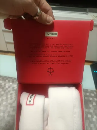Calcetines térmicos de la marca Hunter. - Material polar suave. - Diseño alto para mayor cobertura. - Logo de la marca en la parte superior. - Se pueden poner con cualquier bota alta para dar calor y estética - Usados solo 1 ocasión para 1 viaje