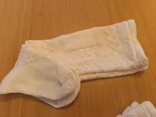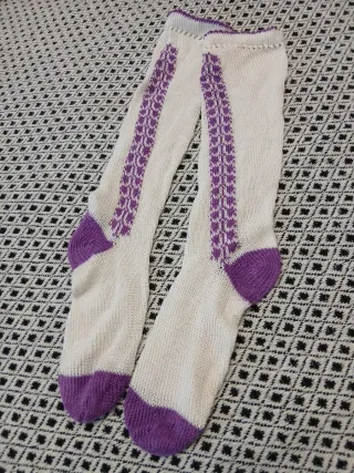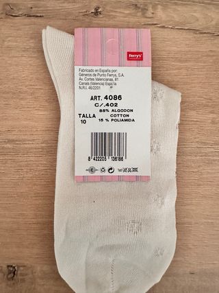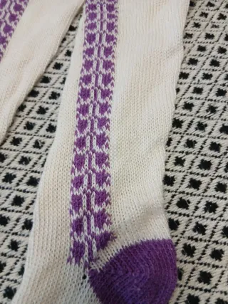Calcetines de fallera de color crudo, con un diseño de rombos. - Tejido con textura. - Largo hasta la rodilla. - Tres son talla 36/39 y el primero de la foto son talla 35 de niña. - Los más largos son talla 39 y llegan hasta mitad del muslo, habría q cambiarles la goma de sujeción. - Precio 10e la unidad.