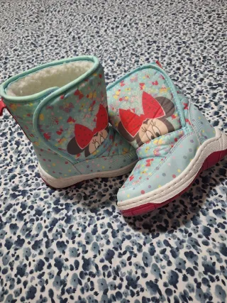 Botas de nieve con diseño de Minnie Mouse para niña. Se encuentran en perfecto estado, solo usadas una vez. Botas infantiles muy cómodas con un acabado impermeable, están diseñadas para ofrecer protección en la nieve y durante los días fríos, reteniendo el calor corporal. Posee un cierre lateral de velcro que facilita el calce y ajuste. La suela de goma proporciona un agarre seguro en superficies resbaladizas (hielo y nieve), mientras que el interior afelpado mantiene los pies abrigados y calientes. Regalo los calcetines de nieve de la talla 23-26.