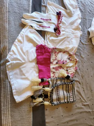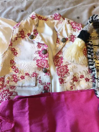 Conjunto completo para traje fallero de niño. Incluye varias piezas para un atuendo tradicional. Talla 4/5 años - Camisa blanca con detalles bordados en rosa. - Pantalón blanco. - Fajín o banda decorativa con flecos. - Manta morellana - Calcetines y lligacames - Chaleco