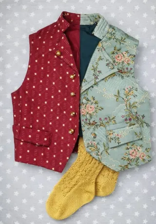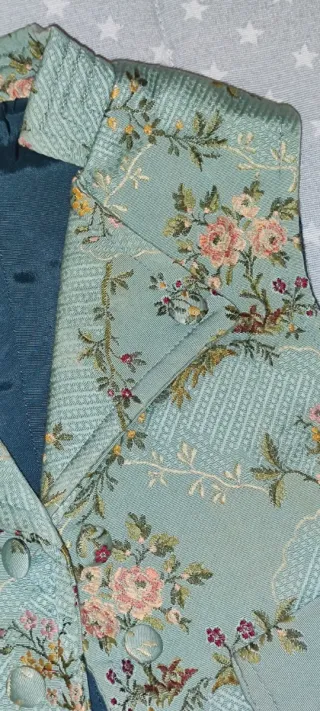 Dos chalecos para niño, ideal para fiestas falleras. Talla 3. Válido desde los 2 a los 4 años aprox. Uno tonos verde claro y otro, granate y oro. Se venden los dos chalecos y un par de calcetines a juego con los dos chalecos. - Diseños con estampado floral y otro grana y oro. - Con forro interior los dos. - Cierre con botones. El lote entero 60€.