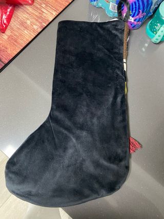 Calcetín de Navidad con diseño de Harry Potter. - Parte superior con pelo rizado marrón. - Cara de Harry Potter con gafas y bufanda. - Cuerpo del calcetín negro.