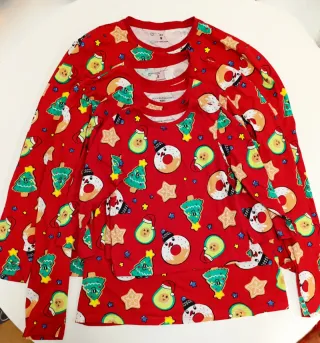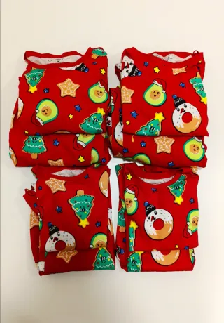 Conjunto de 4 pijamas familiares a juego con un divertido estampado navideño. - Estampado de aguacates, donuts y árboles de Navidad. - Manga larga. - Tallas variadas Adultos S y M. Niños (3-4) y (5-6) (ver etiquetas en fotos). - Como nuevos, poco uso.