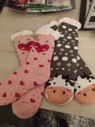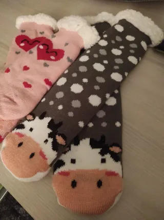 2 pares de calcetines de invierno muy cómodos y con diseños divertidos. Precio por los 2 - Diseño de corazones rosas. - Diseño de vaca con lunares grises. - Forro interior suave y cálido. - Suela antideslizante.