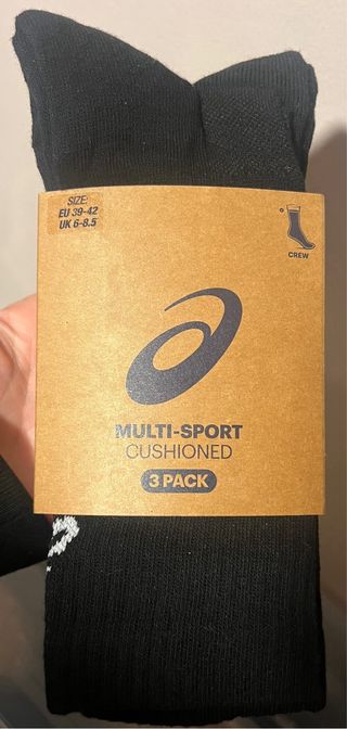 Nuevos a estrenar con su pack sin tocar. Nos los regalaron por navidades a la familia. Pack de tres pares de calcetines deportivos Asics. Tallas: 35-38/39-42/43-46 - Diseño tipo crew. - Suela acolchada para mayor comodidad. - Soporte en el arco del pie. -Muy utilizados en tenis y padel.