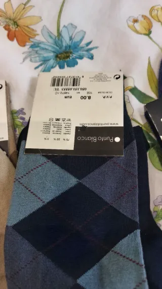 Pack de calcetines a estrenar. - Talla 42. - Diseño de rombos en tonos beige y marrón. - Diseño de rombos en tonos azul marino y azul. - Calcetines lisos en color azul marino. - Calcetines lisos en color burdeos. - Calcetines lisos en color marrón. - Calcetines lisos en color verde azulado. - Calcetines con estampado de puntos en gris y negro.