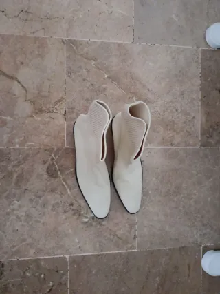Botín de estilo calcetín en color beige, sin estrenar. - Tacón grueso y cuadrado. - Punta fina. - Caña elástica.