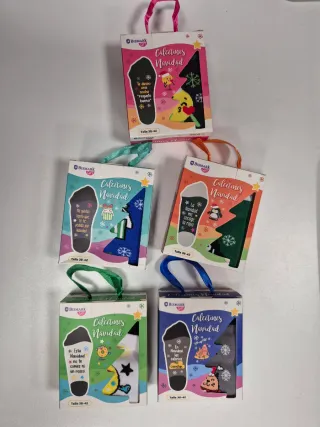 Conjunto de 5 pares de calcetines de Navidad de la marca Bismark, presentados en una caja de regalo con asa. Todos están nuevos, sin estrenar y con su etiqueta original. En las fotos puede ver cada mensaje, que van en las suelas de los pies, para poder utilizarlo en cualquier época del año. Cada par tiene mensaje en un calcetín y un dibujo en su pareja. - Talla única 38-42. Composición: 61,7% algodón, 35,1% poliéster y 3,2% elastano.
