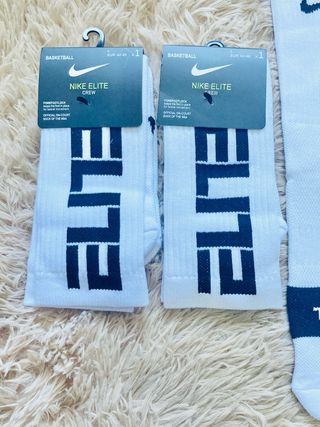 Pack de tres pares de calcetines altos Nike Elite Crew. - Diseño en blanco con detalles en negro. - Tejido transpirable Dri-FIT. - Logo Nike y ELITE en la caña.