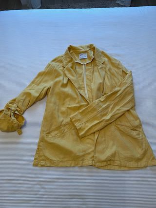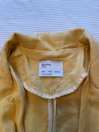 Chaqueta de Bershka en color amarillo. - Diseño de solapa. - Bolsillos frontales. - Mangas enrollables con detalle de tiras. -Aberturas laterales Talla L pero viste como M
