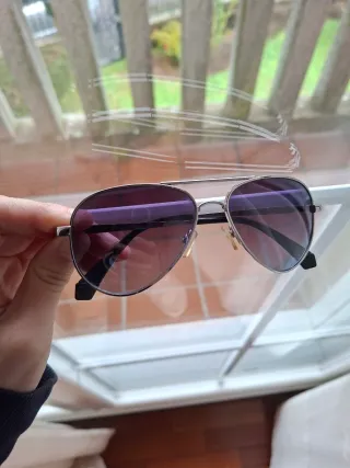 Gafas de sol estilo aviador con lentes degradadas. - Montura plateada. - Lentes con tonalidad morada y azul. - Diseño clásico y moderno.