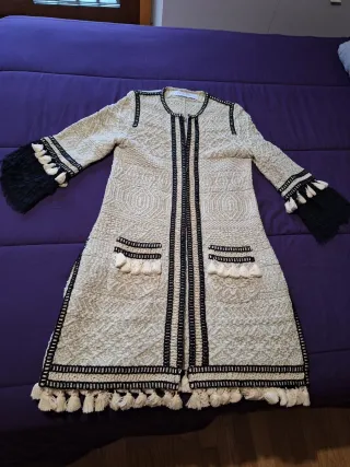 Elegante chaqueta de The Extreme Collection con un diseño texturizado y detalles de flecos. - Tejido principal en color beige. - Ribetes y detalles en contraste negro. - Bolsillos frontales. -Aberturas laterales. - Flecos decorativos en el bajo. - Medidas: 90cm largo medido por la espalda, 36cm ancho espalda. -Talla pequeño.