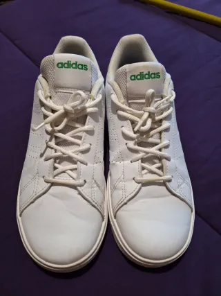 Tenis casuales de la marca Adidas en color blanco, con poco uso, sin ninguna rozadura ni marca. - Diseño clásico. - Cordones blancos. - Logo de Adidas en verde.