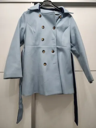 Solo 2 usos. Abrigo de paño en tono azul celeste. Presenta un diseño de doble botonadura y cinturón. - Doble botonadura. - Cinturón a juego. - Cuello solapa.