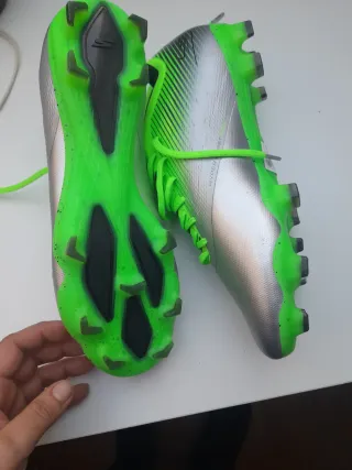 Botas de tacos para fútbol con un diseño llamativo. - Combinación de colores plateado y verde neón. - Suela con tacos para césped. - Cordones a juego.