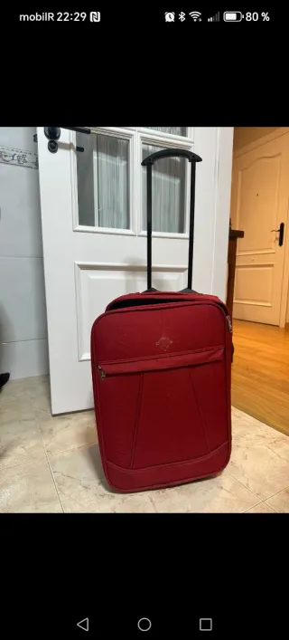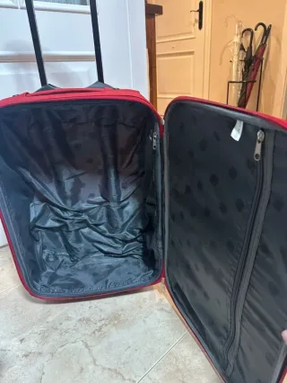 Maleta de viaje roja con ruedas. 51 alto, 35ancho,