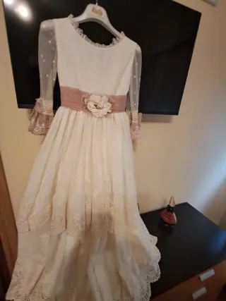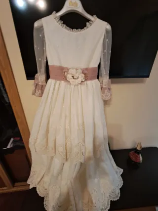 Vestido de comunión para niña, elegante y delicado. - Diseño con mangas de tul y detalles de encaje. - Cinturón rosa con flor decorativa. - Falda con volantes y puntilla. Medidas: Largo total 1.06 Cintura: 26 Hombros: 31 Dela Cintura al suelo: 79