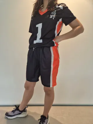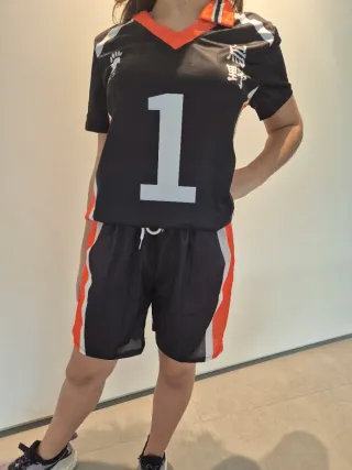 Conjunto de disfraz inspirado en Daichi de Haikyuu. - Camiseta de manga corta con número 1 y detalles en naranja. - Pantalón corto deportivo con franjas laterales naranjas.